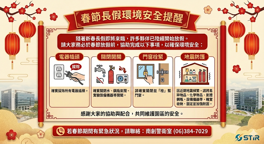 新春長假前,請落實辦公室及實驗室空間水、電、窗戶、設備檢查...
