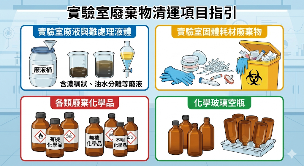 清運項目: 1. 實驗室廢液、不易進料(濃稠狀、油水分離等)廢棄...