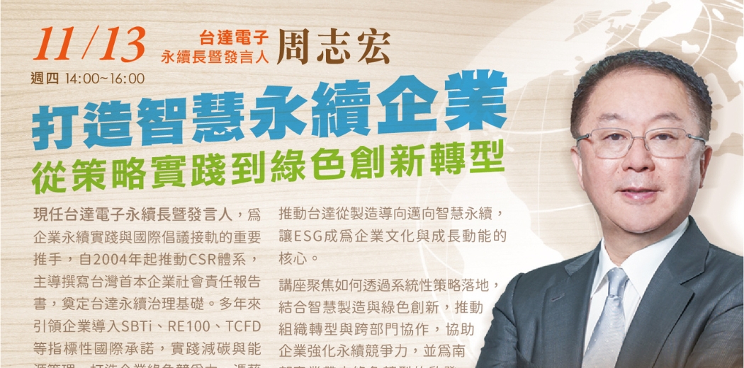 敬愛的業界先進大家好:南台灣創新學苑誠摯邀請大家參加【趨勢名人講座】,今年特別邀請台達電子副總裁暨永續長周志宏擔任主講者,以「打造智慧永續企業:從策略實踐到綠色創新轉型」為題,分享台達電在永續發展上的寶貴經驗。周志宏永續長自2004年起引領...